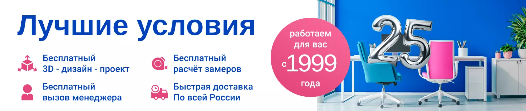 Уже более четверти века мы создаём комфортную и функциональную мебель для персонала. Это не просто рабочие места, а визитная карточка вашей компании. Именно она формирует первое впечатление у клиентов.